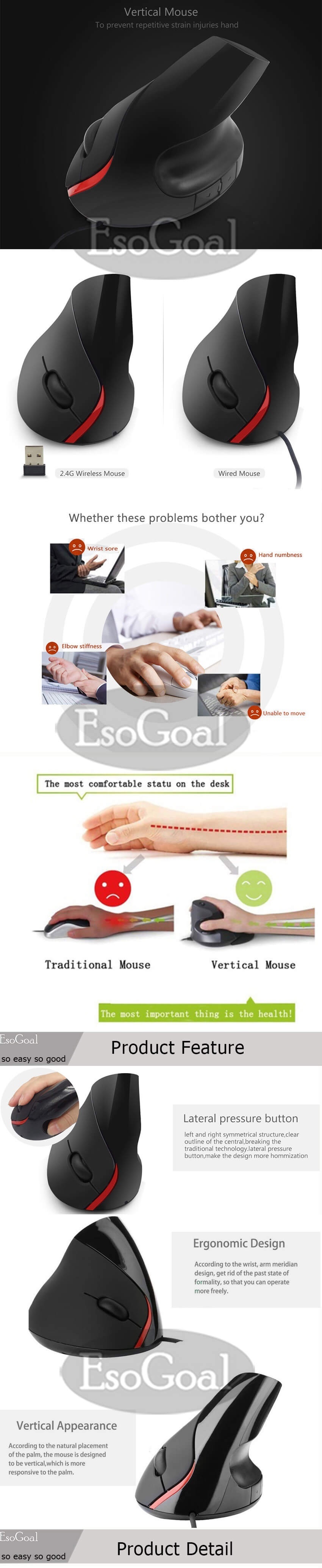 รายละเอียดของสินค้า EsoGoal Ergonomic Mouse High Precision Optical Vertical Mouse Adjustable DPI 800 / 1200 / 1600 Wired Computer Mouse - intl