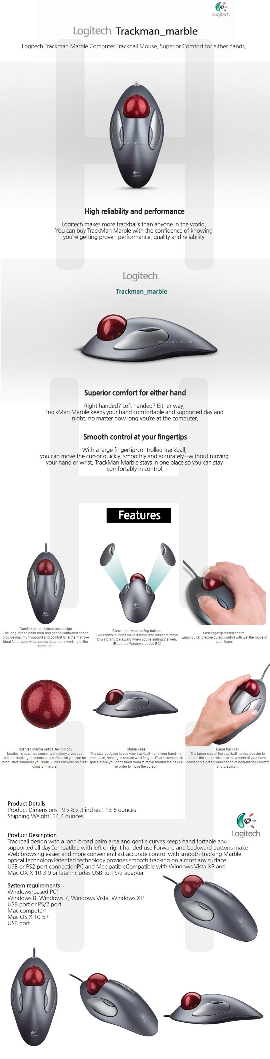 รายละเอียดของสินค้า [Logitech] Trackman Marble Computer Trackball Mouse / Superior Comfort for either hands - intl