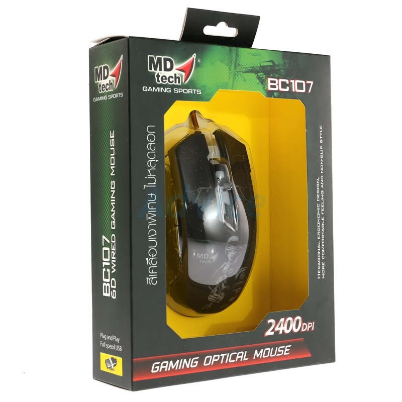 รายละเอียดของสินค้า MD-TECH เมาส์ สำหรับเล่นเกม Mouse MD-TECH (BC-107) Gaming Black Brand :MD-TECH Model :BC-107 Interface :USB High Resolution :2400 DPI Buttons :6 Buttons Sensing technology :Optical Warranty :1Y