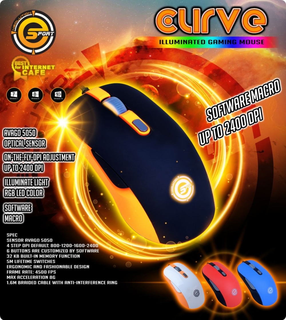 Neolution E-Sport CURVE Gaming Mouse เมาส์ดีตกไม่แตก นอกจากความเรียบหรู ของเมาส์แล้วยังคงทนต่อการใช้งานเป็นอย่างมาก สามารถตั้งมาโครได้ 6 ปุ่ม สามารถปรับ DPI ได้สูงสุด 2400 DPI มาพร้อมให้เลือก 4 สีด้วยกัน