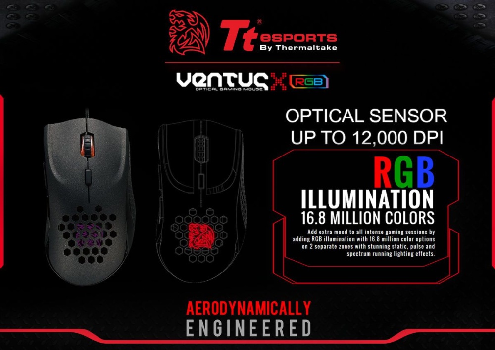 รายละเอียดของสินค้า Tt eSports VENTUS X RGB Optical Gaming Mouse Tt eSPORTS Ventus X RGB เกมมิ่งเมาส์รุ่นใหม่ LED 16.8 ล้านสีพร้อมเซ็นเซอร์แบบ Optical เสริมความแม่นให้กับตัวคุณ